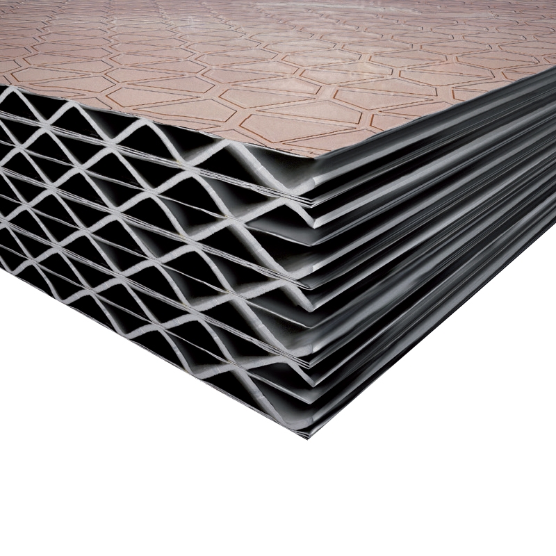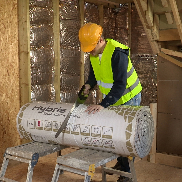 Hybris is a reflective insulation product for timber frame or masonry walls, pitched roofs or ceiling applications. Based on a honeycomb structure made of shaped polyethylene foams glued to aluminium coated polyethylene foils. High thermal performance is provided by a special structure composed of a large number of low emissivity cavities, protected from dust and excessive air movement. Moreover, the low emissivity external films provide additional thermal resistance, when associated with air cavities.