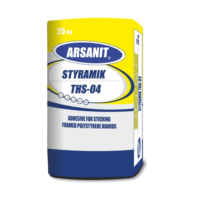 Arsanit Styramix THS-04 Foam Polystyrene Board Adhesive is a dry mix of high quality cement, mineral fillings and polymer modifiers and is used for adhesively fixing foamed polystyrene boards on typical mineral substrate such as bricks, traditional cement plaster and concrete. Styramix THS-04 can be used for filling small depletions.