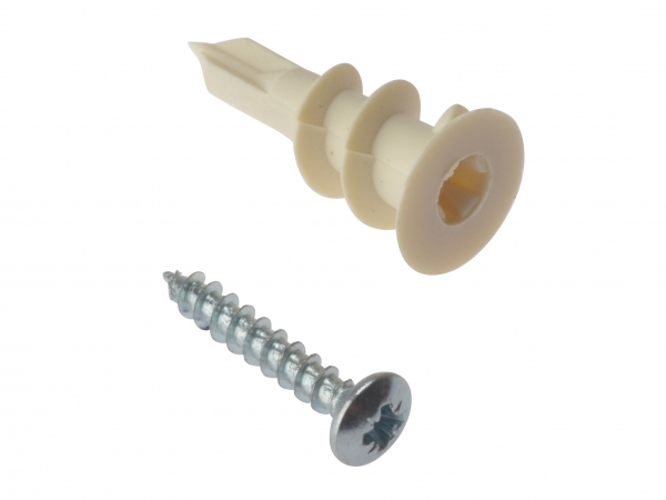 Forgefix Nylon Speed Plug Plasterboard Fixings are supplied with pozidrive compatible 4.5mm x 35mm round head screws, although alternative screws can be used if required. Nylon speed plugs can be used in electrical installations and are suitable for use in most types of hollow walls and plasterboard.
