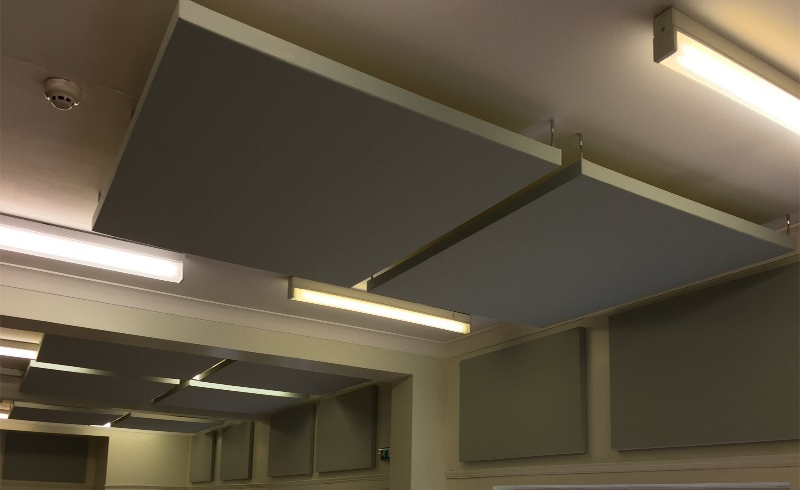 Horizontal ceiling baffles from JCW Acoustic are supplied with bullet fixings and a 1m wire for secure fixing.