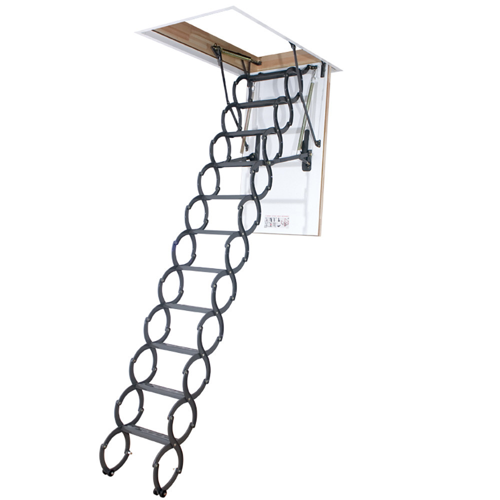 The LST scissors loft ladder is complete with white insulated hatch, wooden ladder box, metal finishing lining and quick-installation brackets. The scissors ladder construction takes less space allowing the ladder to be installed in smaller openings (the smallest ladder size is 51 x 80cm).