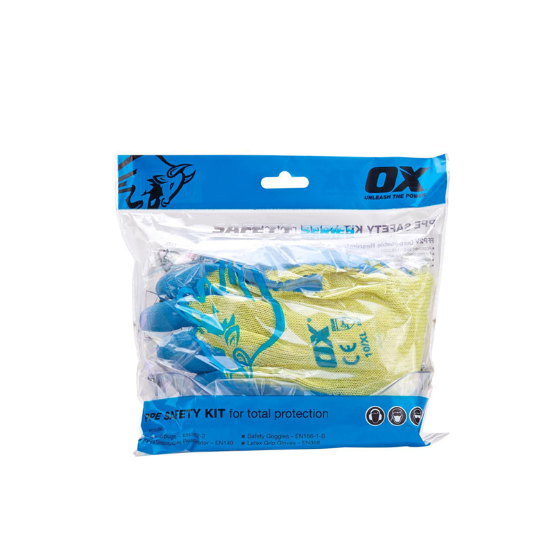 The OX Poly Bag Safety Kit contains - 1x FFP2V Fold Flat Disposable Respirator1 x Safety Goggles1 pair x Corded ear plugs1 pair x Latex Grip Gloves Read More