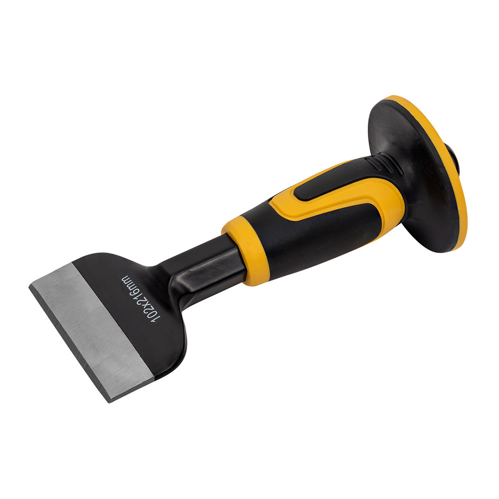 Available in different shank sizes, this Roughneck Brick Bolster comes equipped with a comfortable grip that includes a protective hand guard to prevent overstriking. It is also constructed from steel that has been drop forged and heat treated to enhance sturdiness and durability.