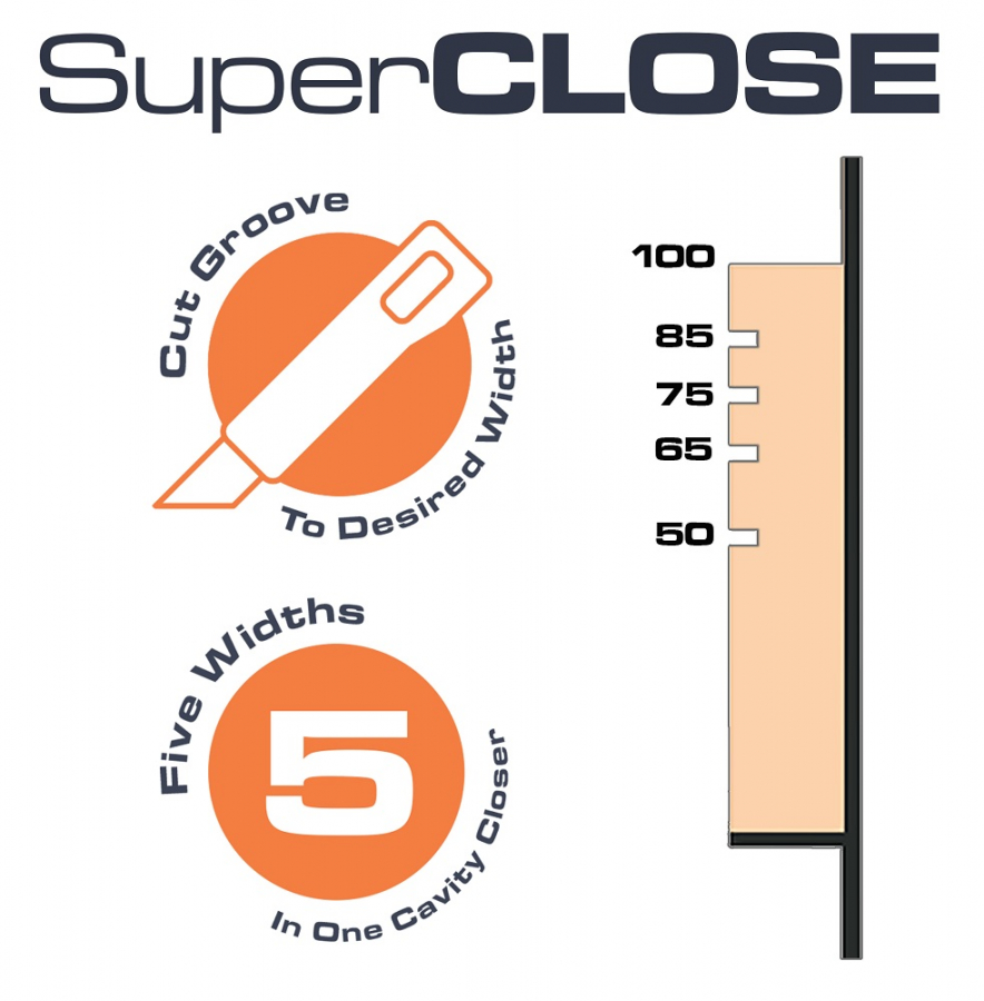 Available with five convenient widths in one product, this SuperCLOSE insulated cavity closer has been designed and made in the UK with high-quality materials. It offers versatile installation options, including vertical and corner jointing. For your desired width, you can simply cut along the groove.