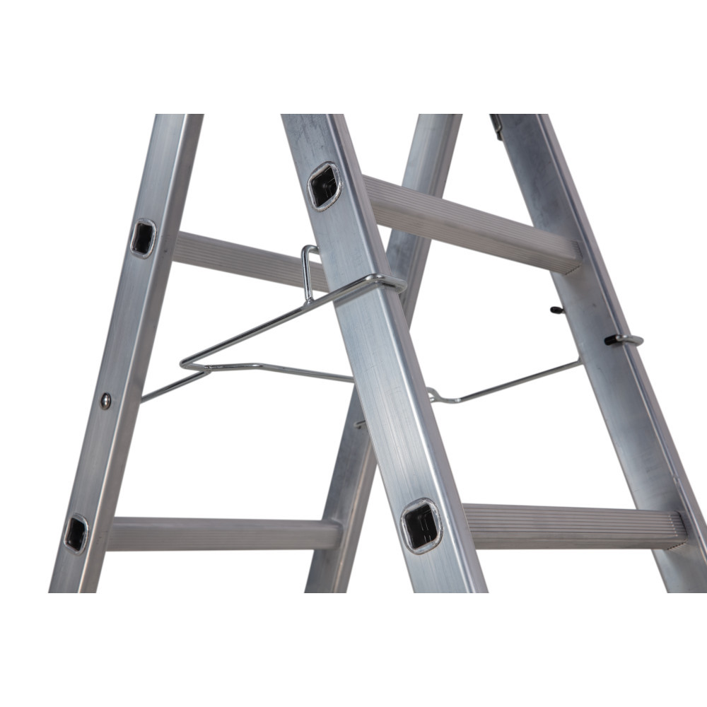 This aluminium 3 in 1 ladder has been designed to be used in 3 different positions to adapt to your needs. To increase security and stability of this ladder, it has been equipped with a locking restraint and slip resistant rungs. The rungs are square to improve comfort when at a height.